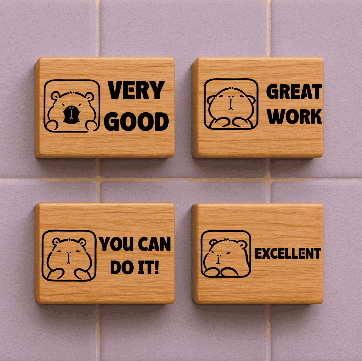 Este set incluye 4 sellos con simpáticos diseños de capibaras y frases en inglés que refuerzan el aprendizaje positivo: