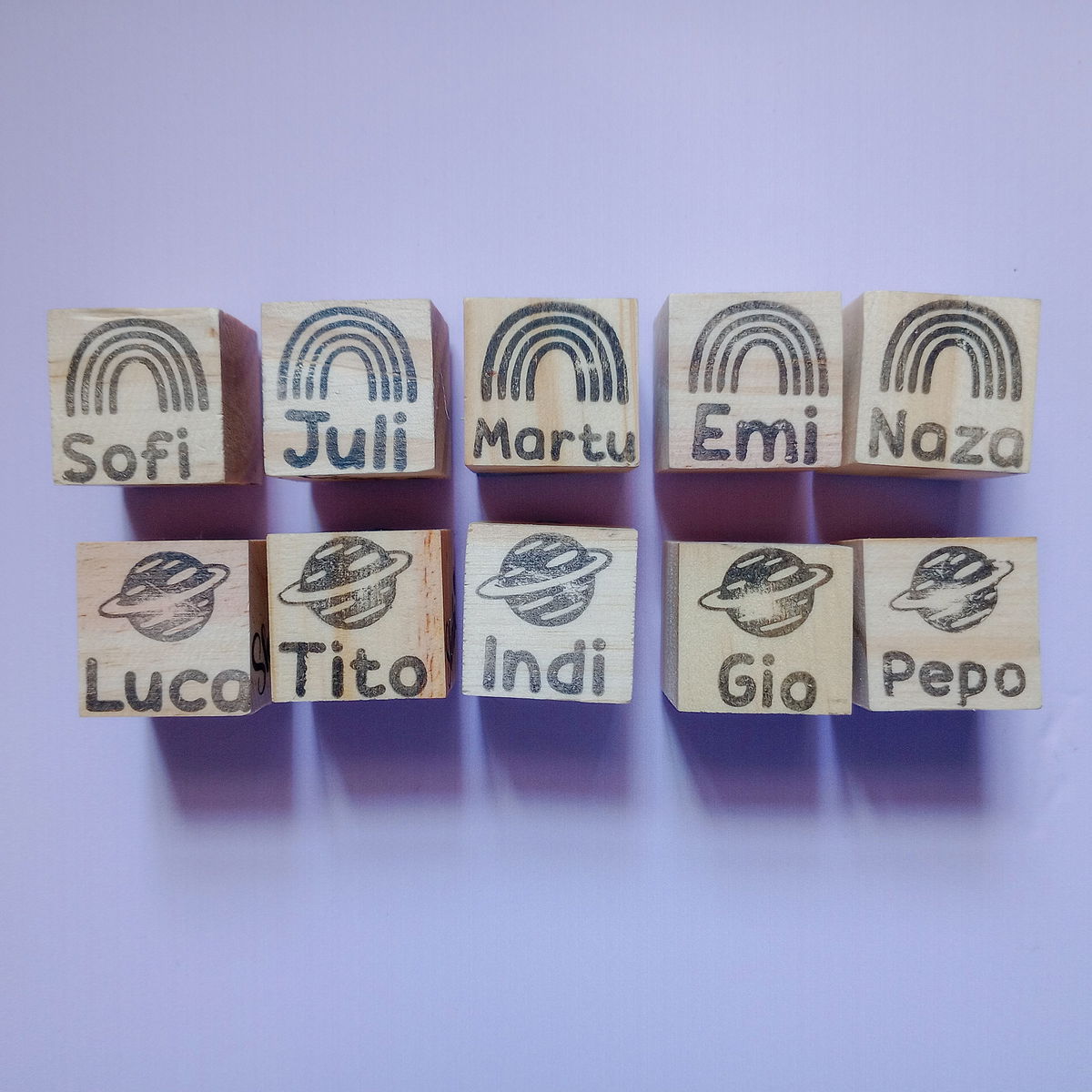El set incluye 10 sellos de madera personalizados con nombre y temática y 10 tintas de colores surtidos para que cada niño o niña tenga su propio sello único.